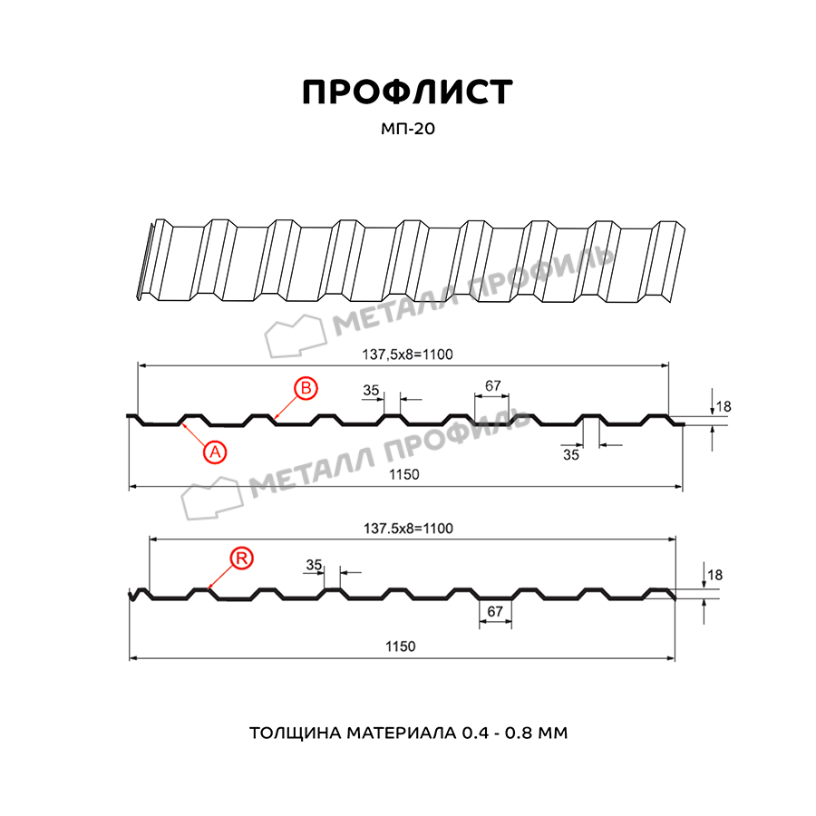 Профиль МП-20 характеризуется трапециевидной формой с высотой волны 20 мм, что обеспечивает высокую жесткость и несущую способность. Толщина металла 0,45 мм позволяет использовать его в конструкциях с умеренными нагрузками, таких как заборы или навесы. Ширина листа составляет 1150 мм (полезная — 1100 мм), что упрощает монтаж и минимизирует отходы. Этот профиль устойчив к деформациям и подходит для регионов с ветровыми нагрузками, предлагая оптимальное соотношение веса и прочности.